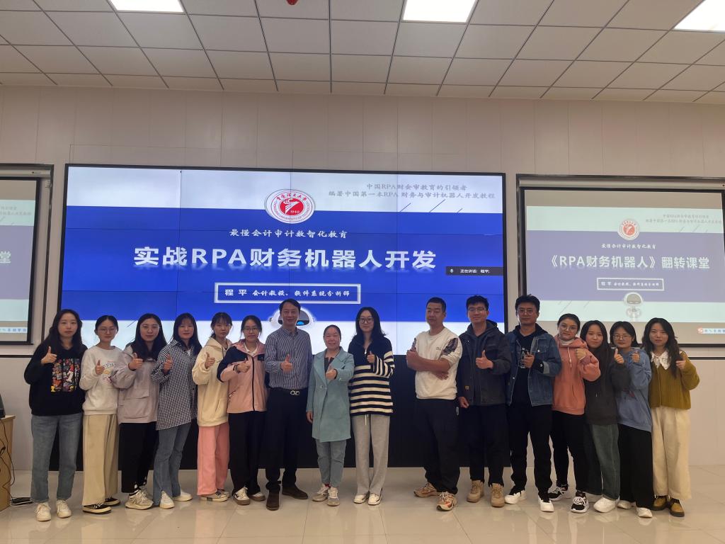 程平教授理论和实战并重,除了传授“RPA”相关理论基础和技术要点外,更注重师生们的实操经验,告别全理论枯燥课堂,打造“理论+实战”特色教学模式,激发了师生们的学习热情。程平教授带着大家一起做了“股票入手知多少机器人”、“自动收取邮件机器人”等多个项目,让师生们更加直观地感受到RPA财务机器人的相关功能。在场师生无不为这先进的技术所折服,惊叹于RPA财务机器人在财务问题处理方面的高效性。程平教授指出,在数字化转型的当下,师生们须把握好时代背景,抓住机遇迎接挑战,在传统财会知识的基础上还需掌握大数据和人工智能等新知识,加强学习、不断提升自身专业素养。