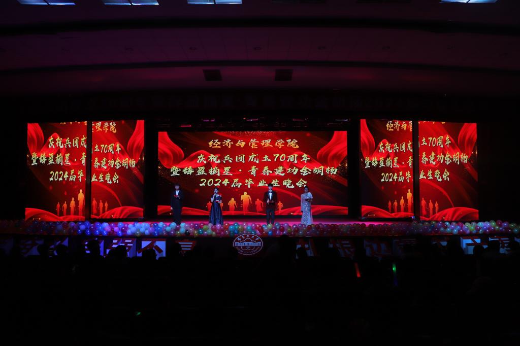 6月5日晚,经济与管理学院“兵团成立70周年暨摘星·青春建功金胡杨”2024届主题毕业生晚会于行政楼B座报告厅举办。学院党委书记蒋志辉,党委副书记朱哲,各系领导及师生代表参加。